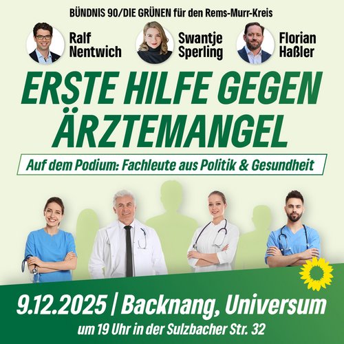 Der Rems-Murr-Kreis scheint vom Ärztemangel und von den Schließungen der Notfallpraxen in Waiblingen, Schorndorf und Backnang ungebührlich hart getroffen. Welche Ideen gibt, es, um trotzdem eine gute ärztliche Versorgung aller zu ermöglichen? Um dieser Frage nachzugehen, hat der Grüne Kreisverband Rems-Murr im Dezember Fachleute aus Gesundheitswesen, Politik und Medien herzlich zur öffentlichen Diskussionsveranstaltung „Erste Hilfe gegen Ärztemangel“ ins Kino Universum nach Backnang eingeladen.